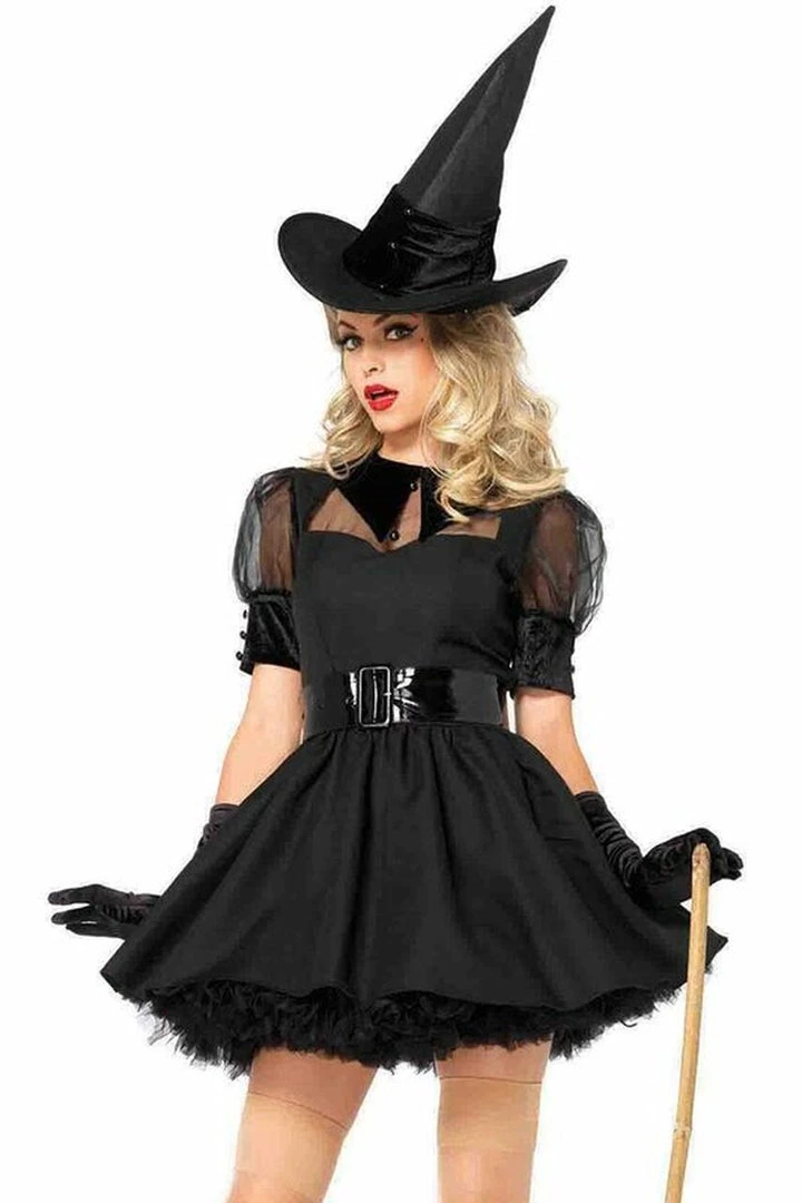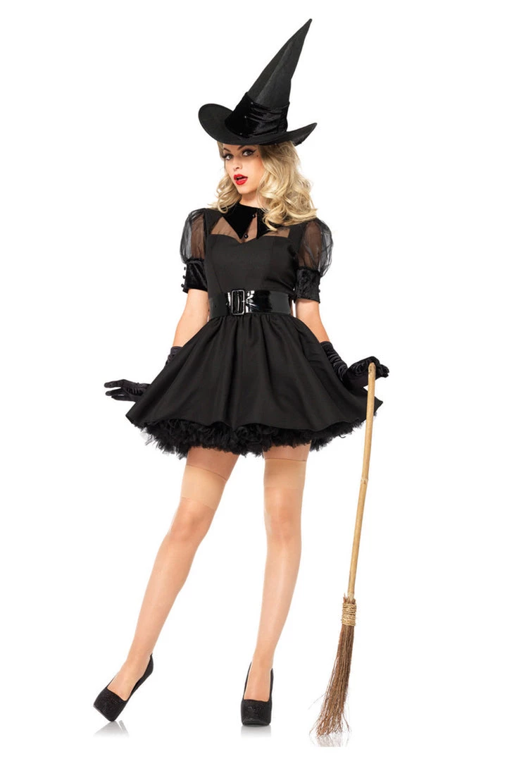 Cast a spell or two in this three-piece, Bewitching Witch costume includes a vintage-style black dress with organza puff sleeves, velvet collar, button details, a wide belt and a matching hat. (Gloves, petticoat and stockings not included.)