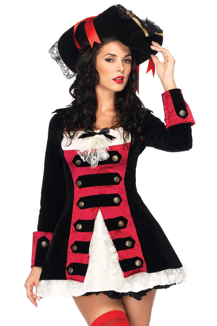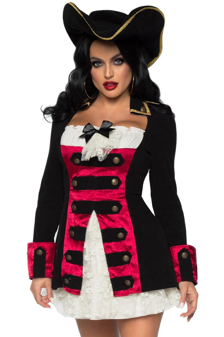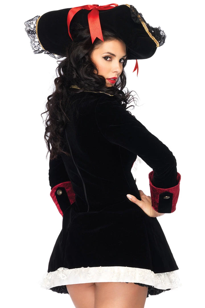 Take the helm in this Charming Pirate Captain costume featuring a layered velvet waistcoat dress with lace trim accents, faux buttons, ruffle trim and a satin bow. (Hat and petticoat not included.)
