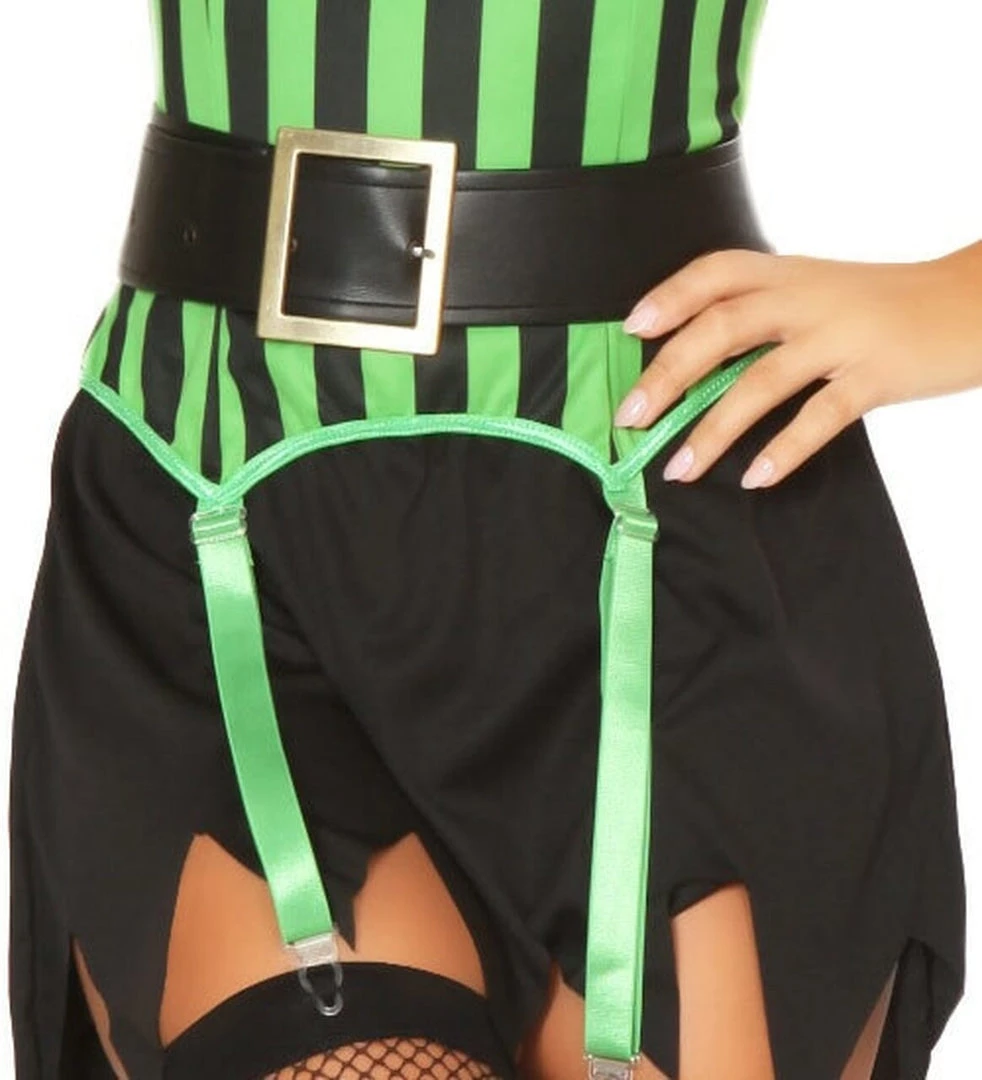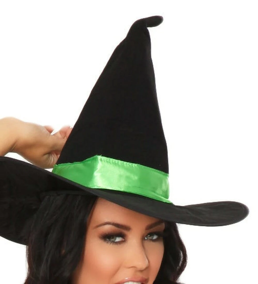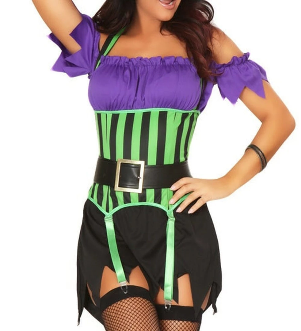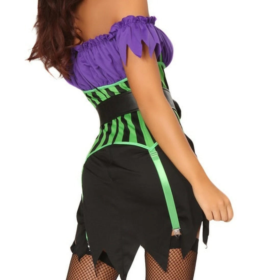 Three Piece Spell Binding Witch Costume includes Off the Shoulder Garter Dress, Belt and Matching Hat.Â