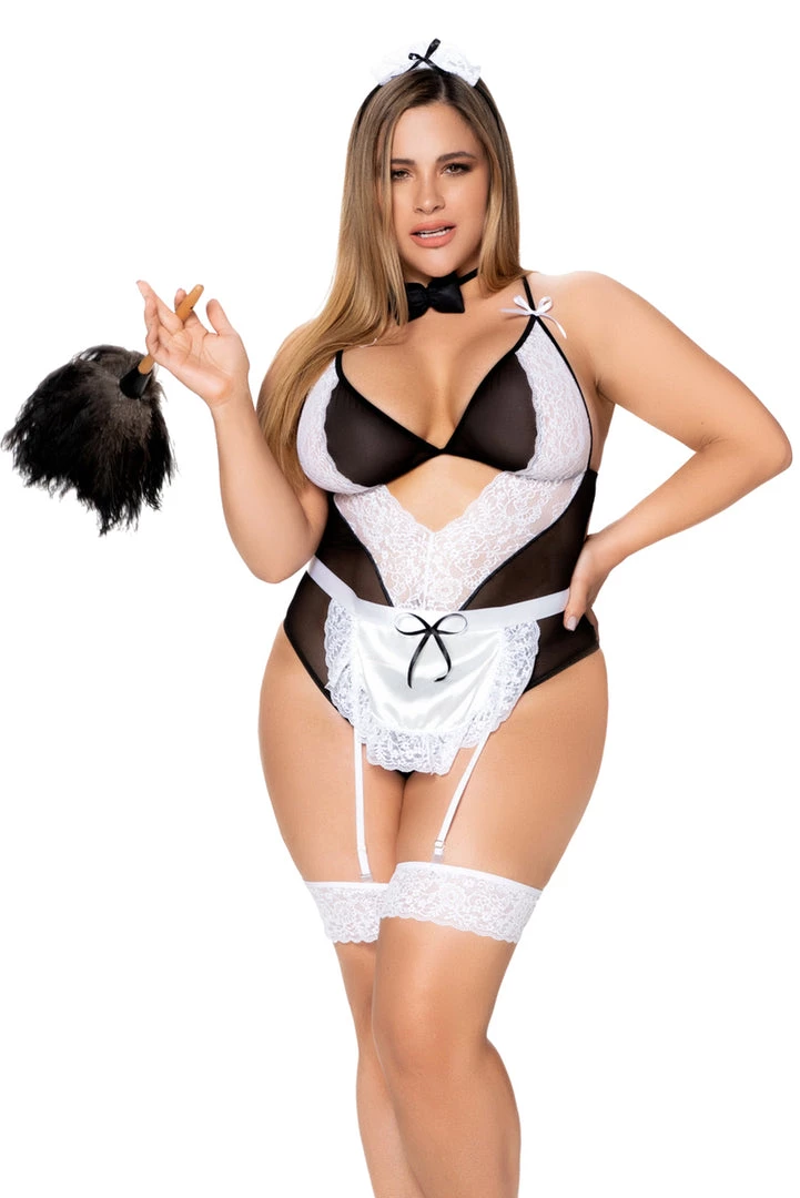 This six-piece, plus size French maid set includes a black mesh and white lace teddy with cut out details, mini satin bows, cross back straps, a lace up bottom, an apron with attached garter straps, white lace leg garters, a bow tie necklace and headpiece.