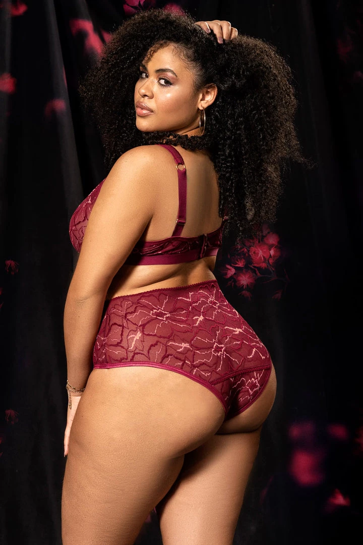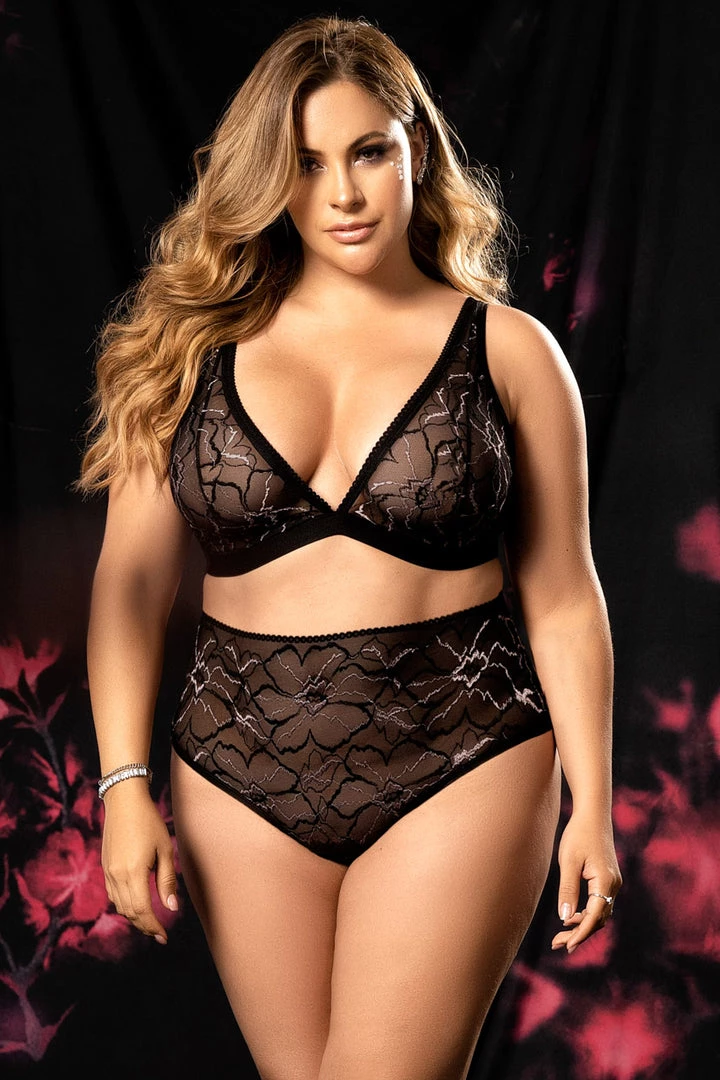 This plus size, pure power set includes a patterned mesh bralette with triangle cups, adjustable straps, hook back, and matching high waisted panty with a cheeky cut back.