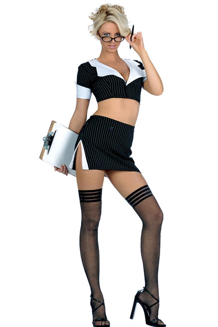 Let loose in this Sexy Secretary Costume! Features a fun and sexy pinstripe secretary outfit with a collared crop top and high waist mini skirt with high slit.