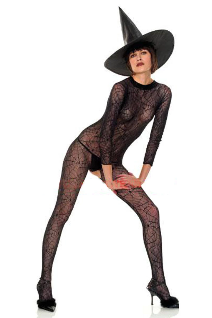 This sheer black bodystocking features a spiderweb print, long sleeves,a high cut neck, and an open crotch.