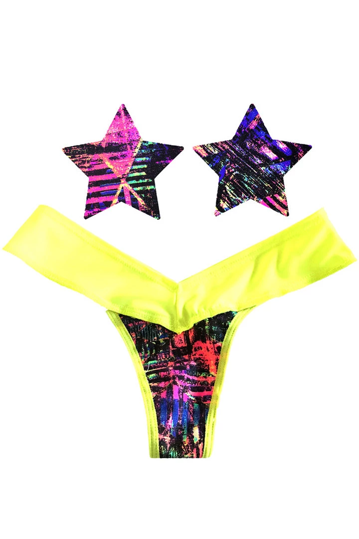 Best worn to parties and events that transcend music and time, these Sporty California Love Nipple Pasties & Thong Panty are designed for the ultimate party warrior! Vibrant and bold AF, this three piece set includes a neon yellow thong panty with neon yellow wilderness pattern. Includes matching star nipple pasties with the same neon black-light reactive design.