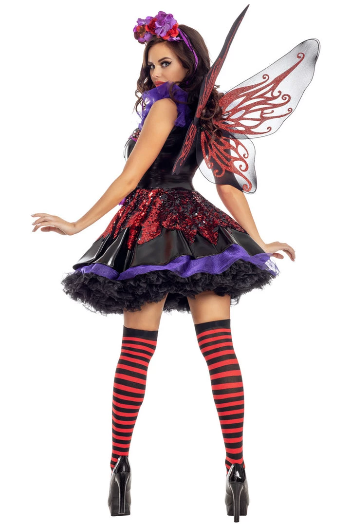 This Dark Fairy costume includes a sequin dress with black wet look detail, a lace-up vinyl waistline, purple ruffled satin trim, a purple satin bow, flower appliques and a matching floral headpiece. (Wings, petticoat and stockings not included.)