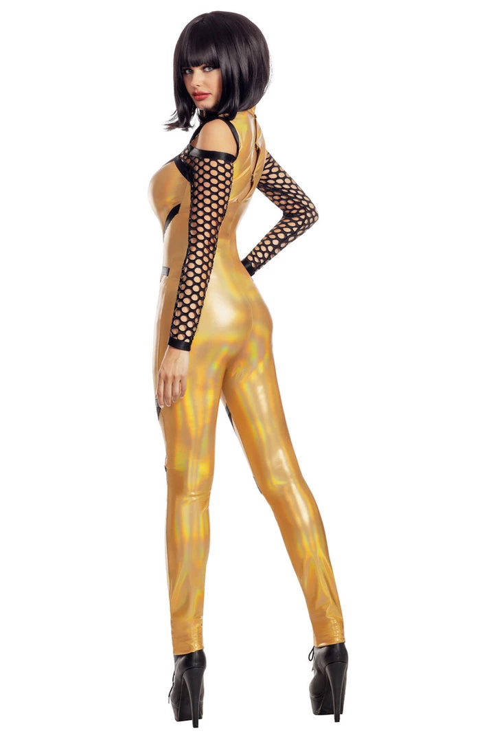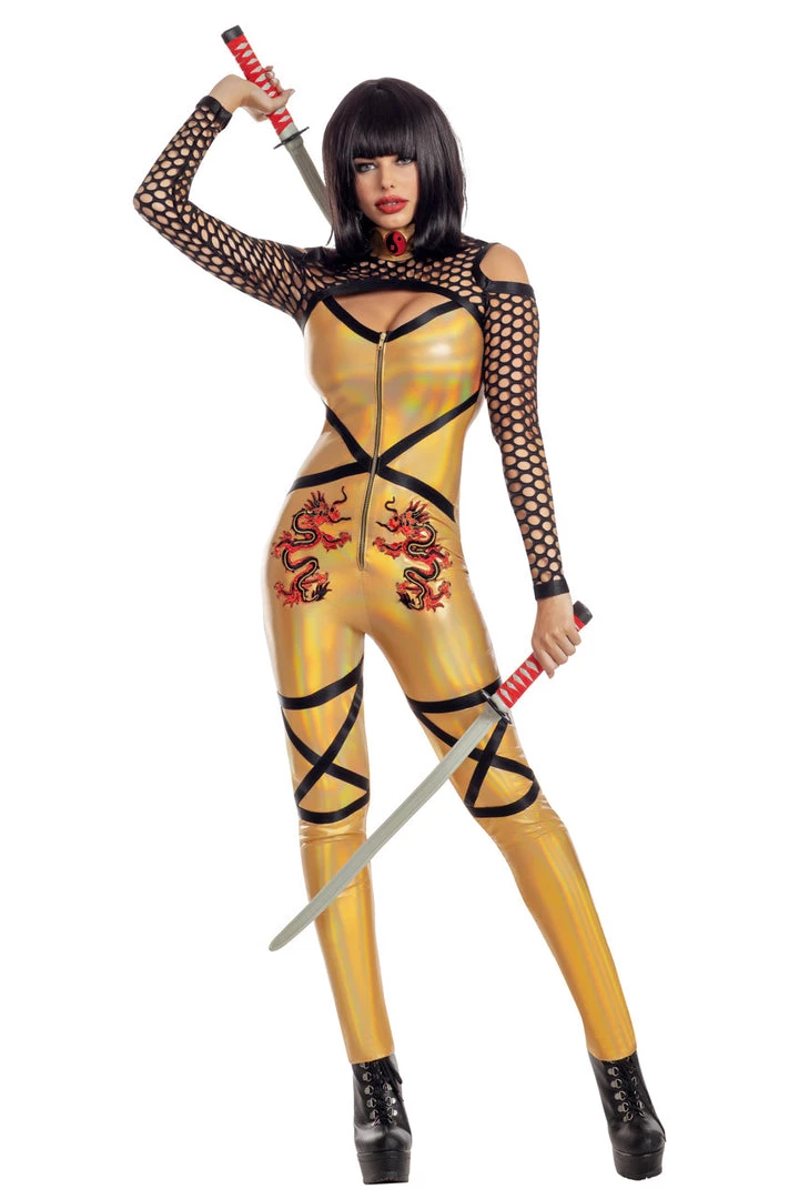 This Golden Dragon Ninja costume includes a gold catsuit with a zip up front, long net sleeves with cold shoulder cut outs, dragon print and black strap details. (Wig and swords not included.)