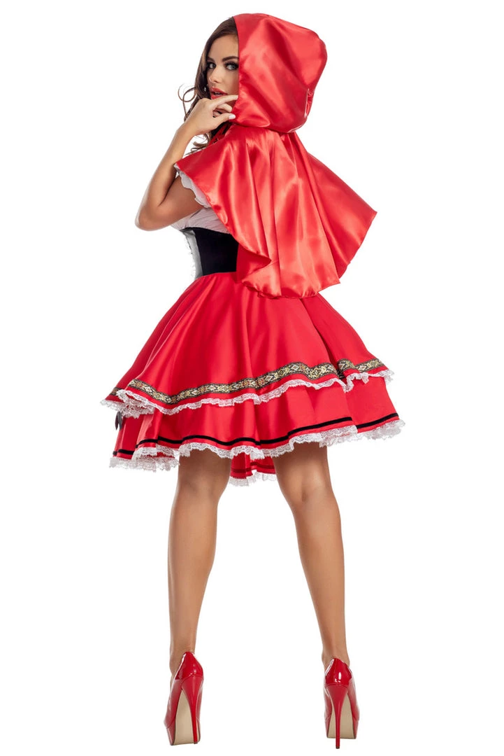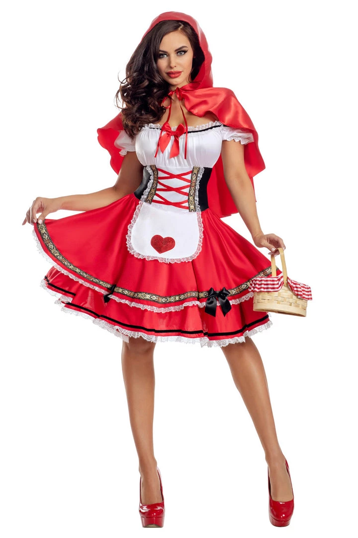 This Sexy Red costume includes a dress with a re skirted bottom, ruffle hem, attached apron with heart detail, black satin bow, a lace-up bodice, a peasant style top with off the shoulder sleeves, red satin bow applique and a red satin cape with an attached hood. (Petticoat not included.)