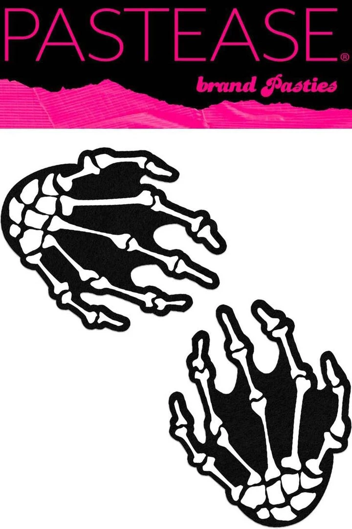 Perfect for a sexy costume for Halloween or any time of the year, these fun skeleton hand self-adhesive pasties are sure to make an impression. Made by Pastease® in the USA from a latex-free and durable eco-felt material, these boney stick-on pasties fit the most voluptuous curves while not wrinkling over erect nipples. Get noticed with little ghoulish accents over your nipples with these 4.5-inch by 3.7-inch pasties in a waterproof self-stick material.