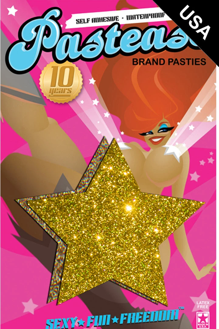 Rock out with these Gold Glitter Star Nipple Pasties that feature a durable no-mess glitter pleather material that forms to curves and resists wrinkling over hardening nipples.