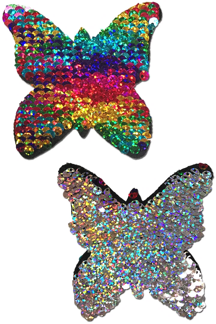 Flutter from flower to flower wearing these Rainbow and Silver Color Changing Sequin Monarch Nipple Pasties that feature reversible sequin material that forms to curves and resists wrinkling over hardening nipples. Just peel-and-stick on clean, dry skin. Brush your finger over the sequins and watch them change from rainbow to silver!