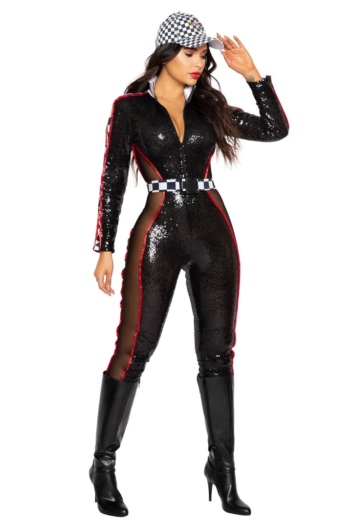 This Glam Racer Babe costume includes a black sequin catsuit with mesh side cut outs, red trim detail, a zip up front and a matching black and white checker print belt. (Hat not included.)