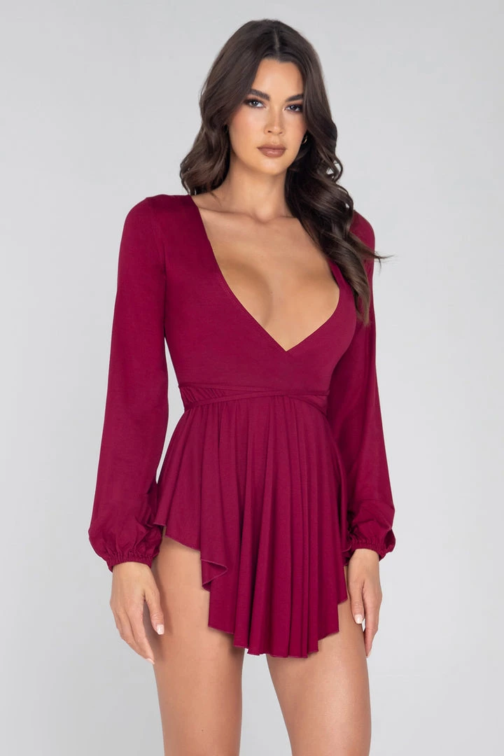 This flirty, long sleeve mini dress features a skater-style skirted bottom, a plunging V neckline and side slits.