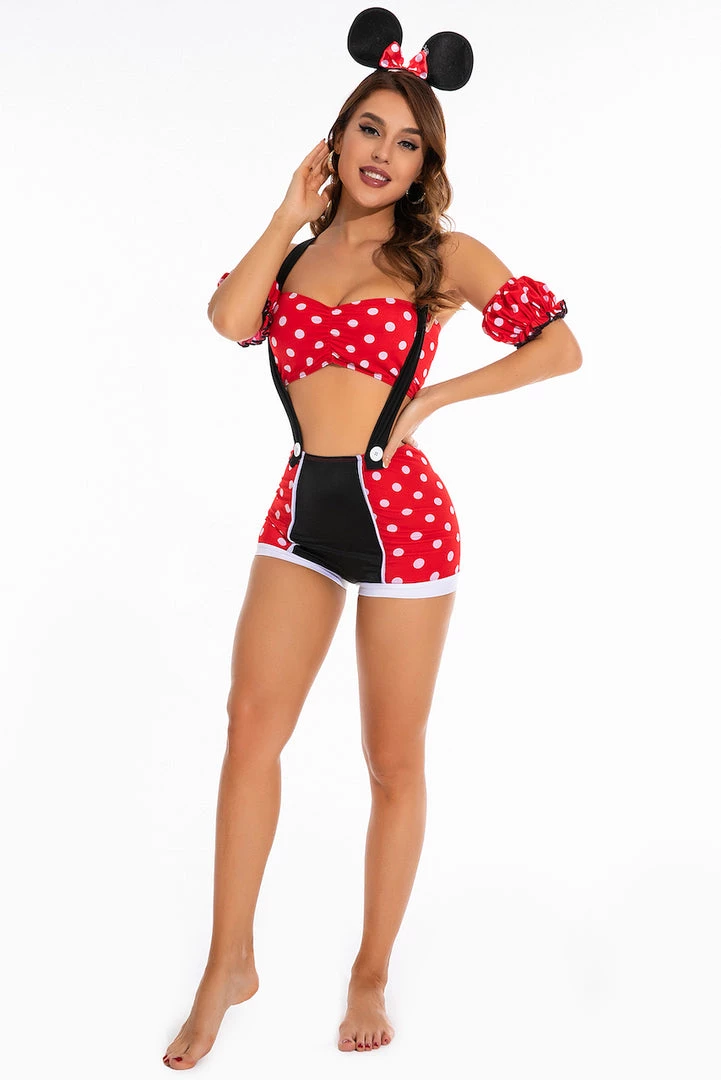 This Pinup Mouse costume includes a red and white polka dot print bandeau top, matching high waisted shorts with attached suspenders, puffed arm sleeves and mouse ear headband. (Stockings not included.)