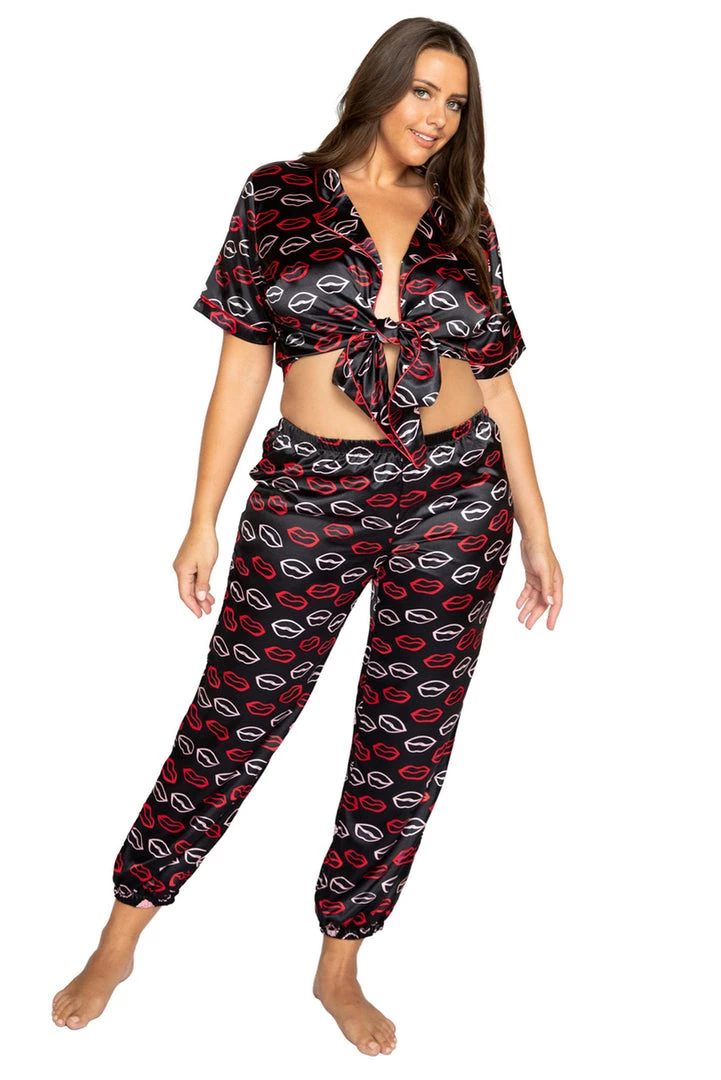 This plus size, satin pajama set features a sassy lip print on a tie front crop top and matching pants with cinched ankles.