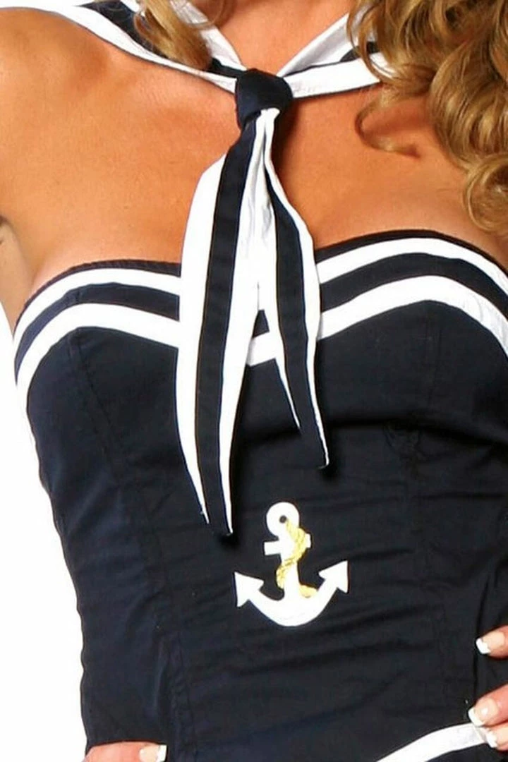 4 Piece Sexy Sailor Costume includes Flair Skirt, Bustier, Hat and Removable Collar. Shown #R1400 Puffy Petticoat not included.
