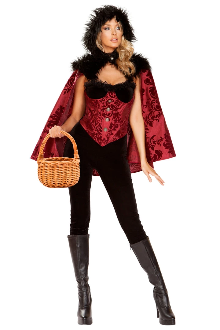 This four-piece, Little Dark Red costume includes a black velvet top, a red brocade waist cincher with button details, a faux fur hooded cape, and black velvet pants.