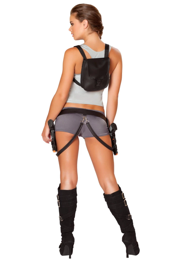 You’ll be ready to raid some tombs in this six-piece Treasure Huntress costume including a grey crop top, grey micro shorts with suspender hooks and attached gun holsters, a buckle front backpack, and four toy grenades. (Toy gun not included.)