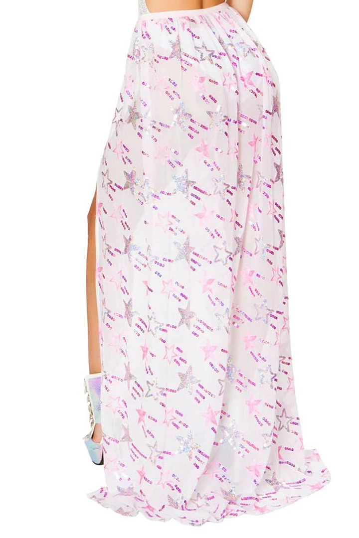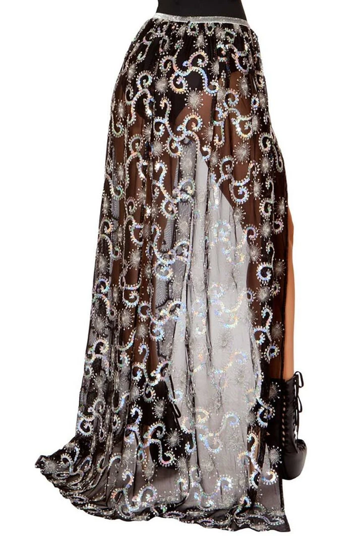Give your lingerie or bathing suit a sense of occasion with this sexy, open-front banded skirt with sequins galore and a sparkling waistband to give it that extra playful shimmer. The black sheer fabric skirt features a stylish sequin pattern in silver and the white sequined banded cover-up features multi-colored shooting stars for added fun!