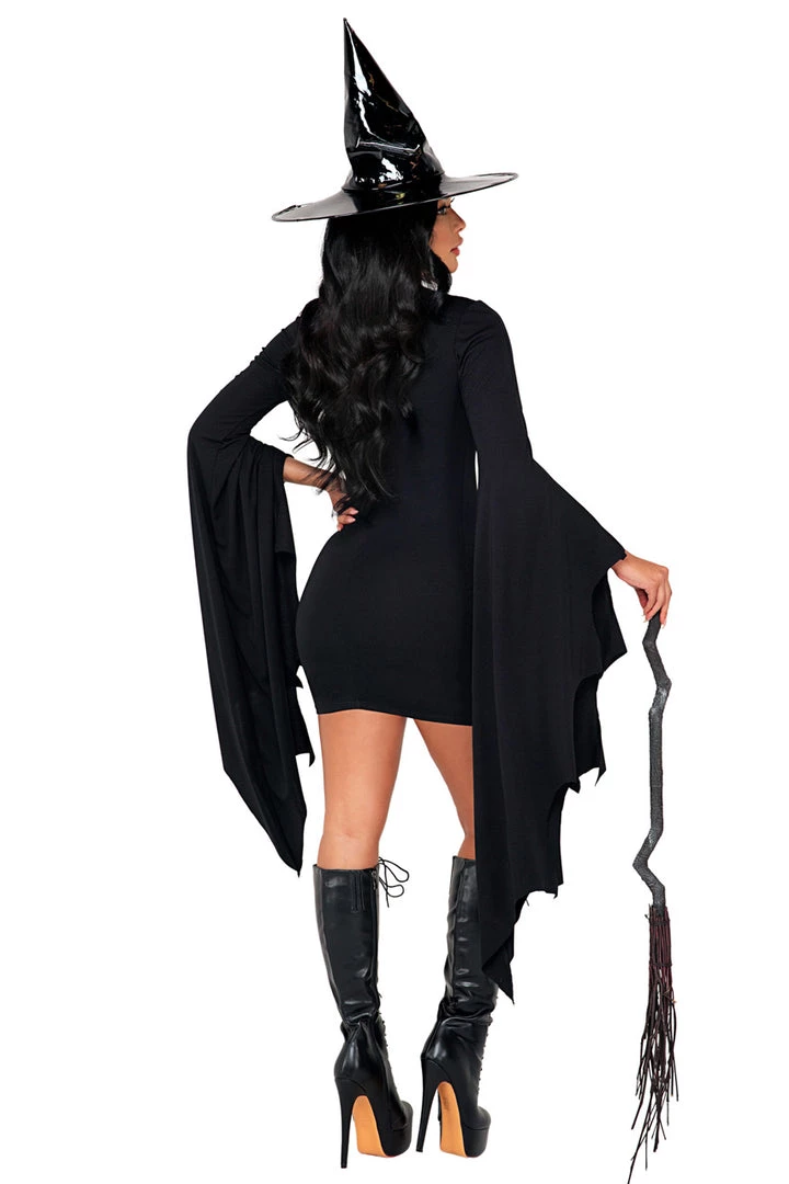 This two-piece, Midnight Coven Witch costume includes a black stretch mini dress with a lace-up bust, draped jagged sleeves, and a matching black vinyl hat. (Broom not included.)