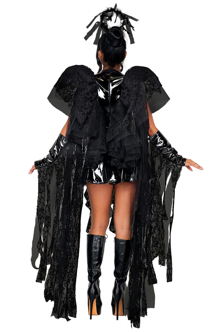This four-piece, Vinyl Angel of Darkness costume includes a black vinyl dress with all over distressed lace details, built-in wings, gloves, belt, and matching headpiece.