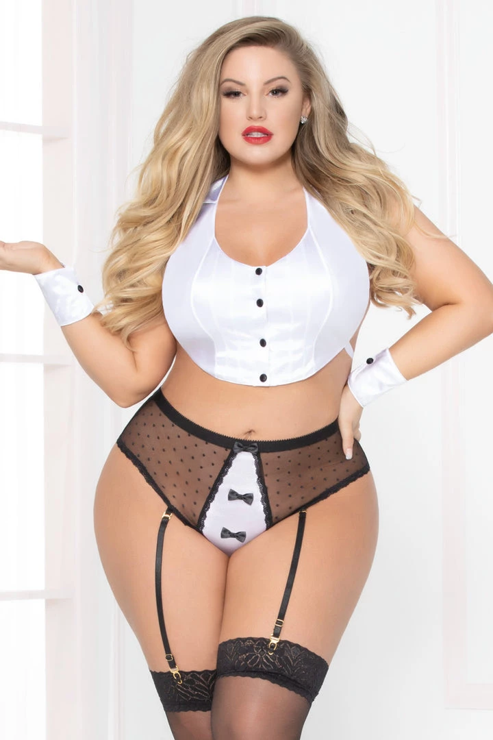 This three-piece plus size set includes a tuxedo-style top with a cowl neck, mini buttons, halter straps, a tie back, matching high waisted panty with a strappy back, open crotch and attached garters and white wrist cuffs. hree piece tuxedo set.