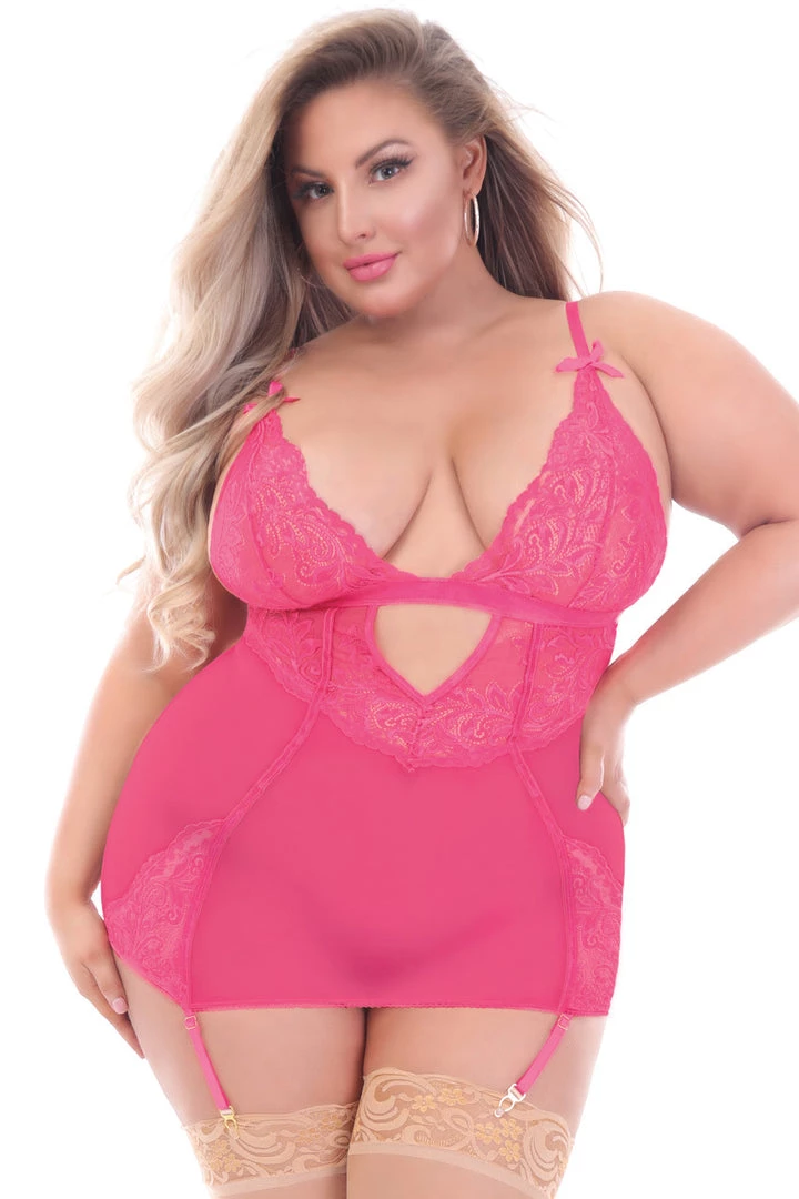 This two-piece, Sweet Temptation pink mesh chemise features a satin ribbon bow back keyhole detail, adjustable straps, removable garters and g-string panty. (Stockings not included.)