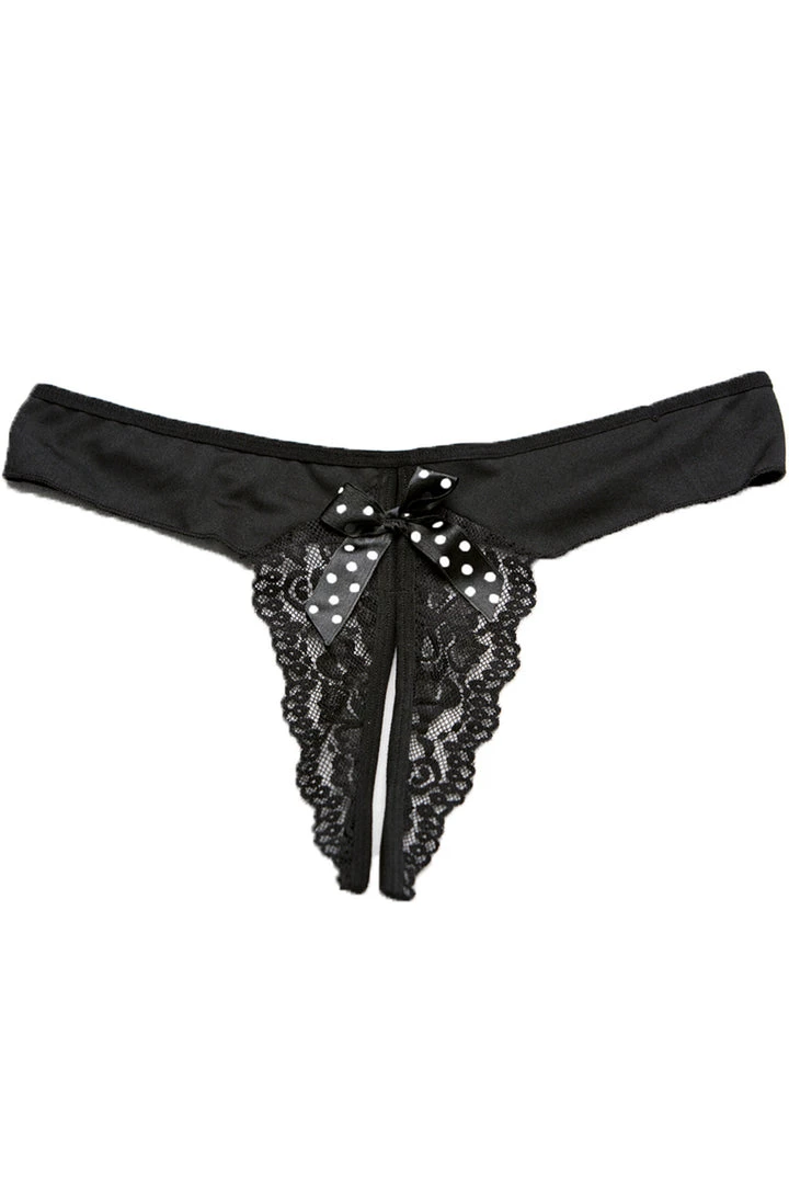 Cute with a twist, this Crotchless Black Spandex Panty with Polka Dot Bow features a black stretch spandex thong panty with lace detail, crotchless cut, and black satin bow with white polka dots.