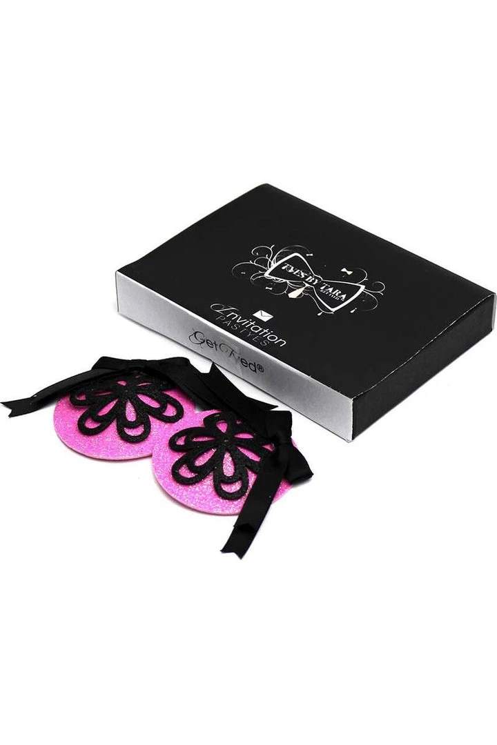 With these alluring Invitation Pasties from Tyes by Tara, you won’t have to say a word to let your intentions be known. They’ll say it all for you! These handcrafted round nipple covers feature a feminine, elegant floral pattern, eye-catching sparkles and a flirtatious satin bow, which sits to the side.